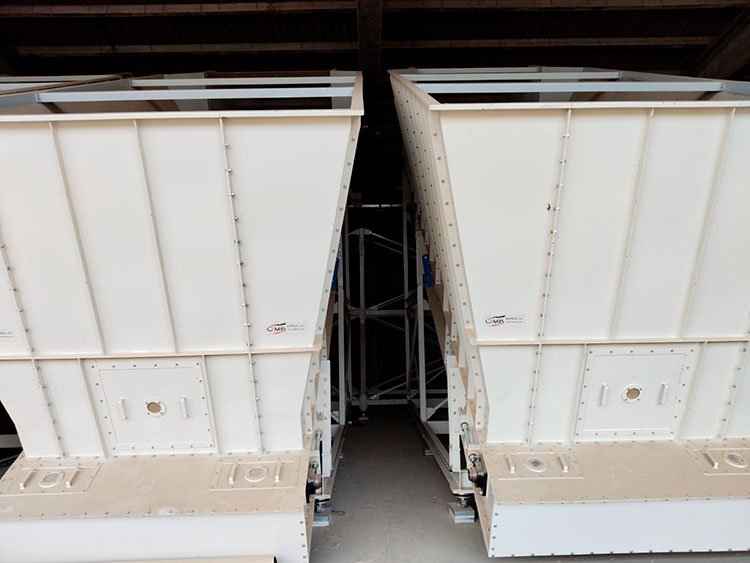 Equipado con dos cadenas de arrastre y empujadores metálicos, que aseguran un transporte continuo y confiable del material.